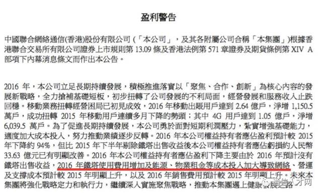 中国联通近期发布盈利预警公告,公告显示,2016年公司盈利预计较2015年下降约94%。