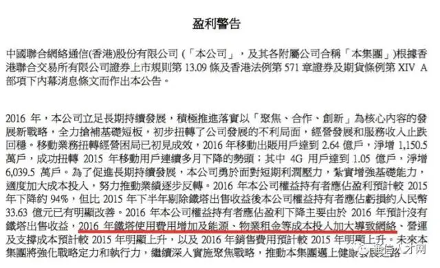 中国联通表示,2016年公司权益持有者应占盈利下降主要由于2016年预计没有铁塔出售收益,2016年铁塔使用费用增加及能源、物业租金等成本投入加大导致网络、营运及支撑成本预计较2015年明显上升,以及2016年销售费用预计较2015年明显上升。