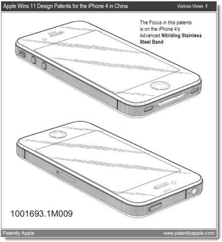 苹果于2010年10月17日向中国提交了11项iPhone 4的外观设计专利申请。上周五,也就是2011年3月18日,他们获得了授权和注册。这些设计专利的文件编号为1001693.1M001至1001693.1M011。