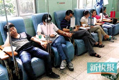 昨日,该公司员工在医院接受点滴治疗。