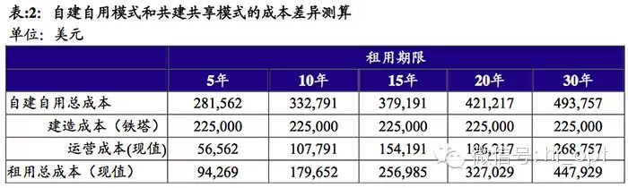 对于通信运营商来说,相比自建自用,租用铁塔公司的铁塔建基站是非 常划算的。假设自建自用模式的运营成本为 12000 美元/年,共建共享模式的租金为 20000 美元/年,测算结果如下。