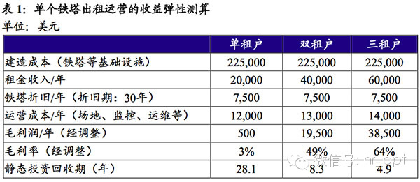 (注:此处的毛利润仅扣除了运营成本,而没有扣除折旧,所以毛利率指标偏高。请见后文的单一基站收益测算。)