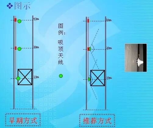 但这种方法有问题,第一是施工麻烦,第二是可能天线或者其他设备掉落,很有隐患,第三点是信号强度和电梯位置有关,当距离电梯较远的时候,接受信号可能会不理想,所以有人就提出这种方法,布置多个天线来解决这个问题: