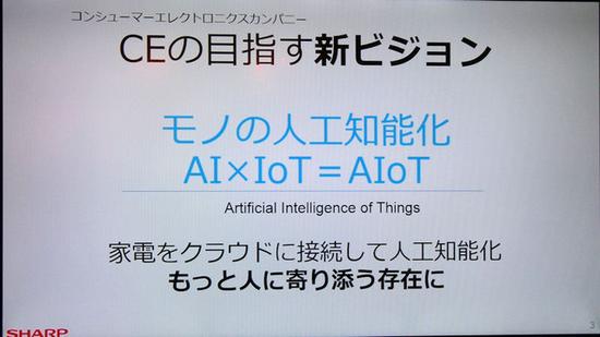 夏普从今年10月1日开始在集团内部导入了“company制度”,而其中包括电视、白电、手机业务在内的的消费电子company中则将物品的人工智能 化,更将物联网的IoT与人工智能AI合二为一提出了“AIoT”的概念。这其中也就涵盖了将家电与云端相连接的人工智能化意义。
