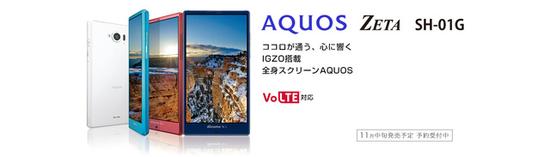 夏 普AQUOS ZETA SH-01G于2014年11月中旬正式发售,从外观上来看是夏普进来一贯的窄边框设计,三边均为极窄边框,只有底部因为放置了 前置摄像头和DoCoMo logo而略宽一些。这款产品共有四种颜色,包括靛蓝色,珊瑚粉,纯白色与蓝绿色,可以覆盖到大部分用户群。