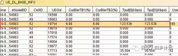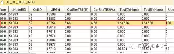 同时跟踪52小区和49小区的MTS用户情况,可以看到50小区下面有一个流量较大的用户(前台做测试的CA终端),UEGid为19754,这个终端在52小区下面接入,只在50小区下面产生了流量,而CA协同小区49小区下面没有产生流量,表明辅载波(49小区)是没有激活的。