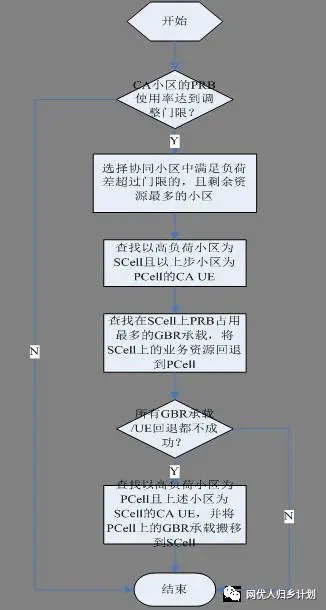 CA下载波间负荷调整功能打开后,周期性监控小区的PRB占用情况,如果超过载波间负荷调整的门限(默认值为50%,后台可配置),则在高负荷小区的CA协同小区中,挑选比高负荷小区的负荷低10%以上的负荷最轻的小区,作为载波调整的目标小区;如果存在以高负荷小区为辅载波,以目标小区为主载波的UE,将UE上已被搬移到高负荷小区上的GBR承载回退;如果没有这样的GBR承载,则挑选高负荷小区中CA用户上速率最大的GBR承载,搬移到目标小区上。流程如下图所示:
