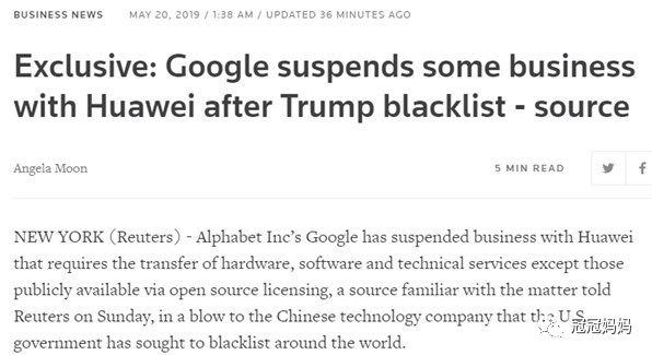 下面是国外网站发布的关于Google停止安卓与华为合作的新闻: