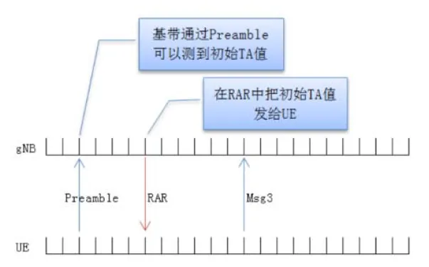 gNodeB根据Random Access Preamble测量得到UE侧的定时偏移,通过RAR消息携带给UE。