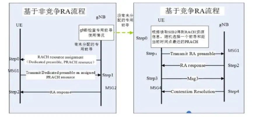 NR中的随机接入流程与LTE的基本相同,通过发送preamble启动接入过程,接入过程也分为竞争接入和非竞争接入(通过使用不同类型的preamble来区分)