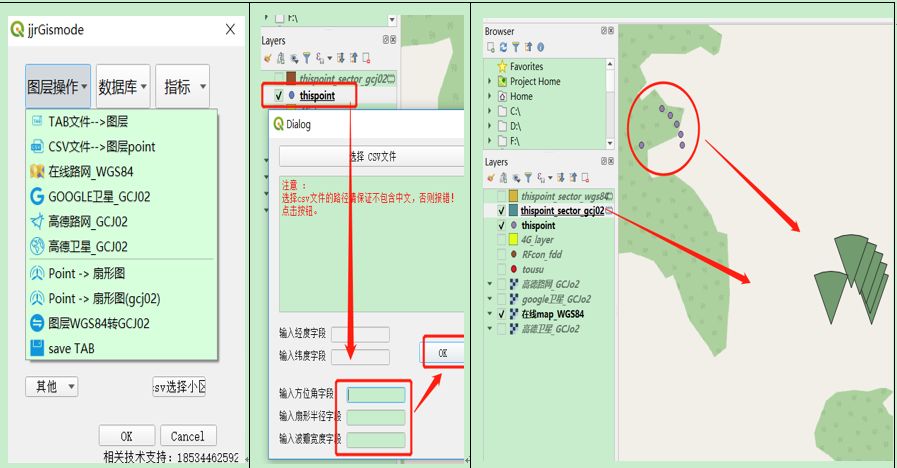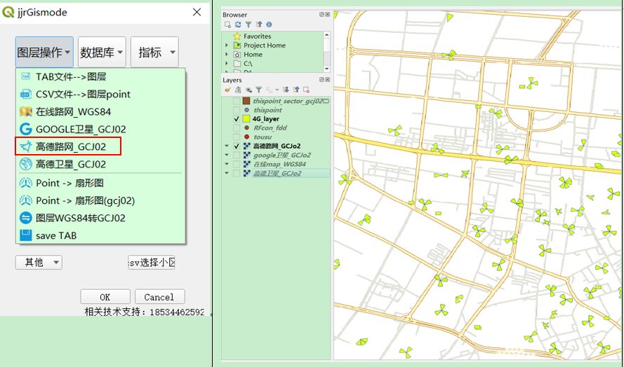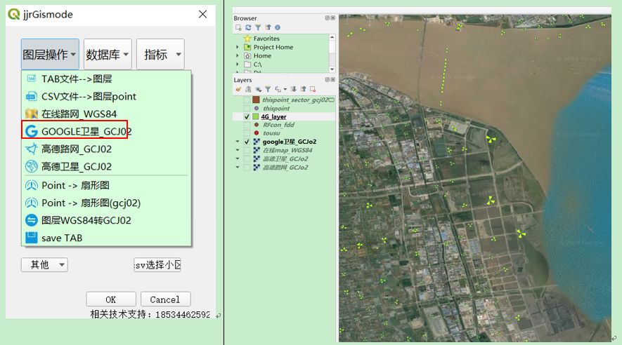 我们常用的我们常用的google卫星地图也有,比google地球好很多,图片清晰,加载速度快,不用动不动改host文件,是GCJ02的坐标系,直接导入的WGS84的点图和扇形图可以通过下边的“图层WGS84转GCJ02”,使图层和卫星地图坐标对齐
