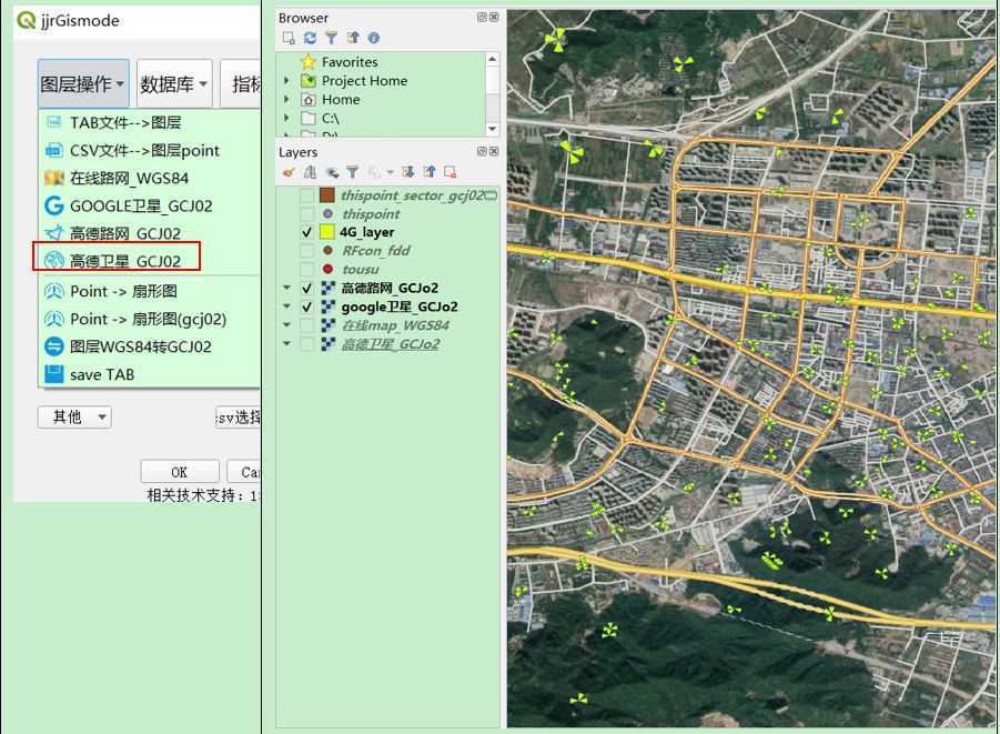 高德卫星地图和google卫星一样都是GCJ02的,我们常用的WGS84图层导入后可以通过下边的“图层WGS84转GCJ02”功能坐标对齐。个人觉得高德卫星地图色彩更鲜靓一点。