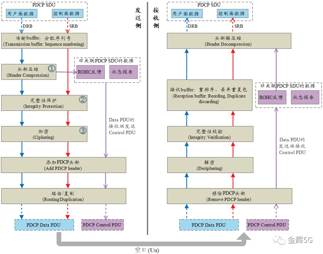 步骤二:PDCP实体会对用户面数据进行头部压缩处理。头部压缩只应用于用户面数据(DRB),而不应用于控制面数据(SRB)。虽然图中并未明确注明,但用户面数据是否进行头部压缩处理是可选的。