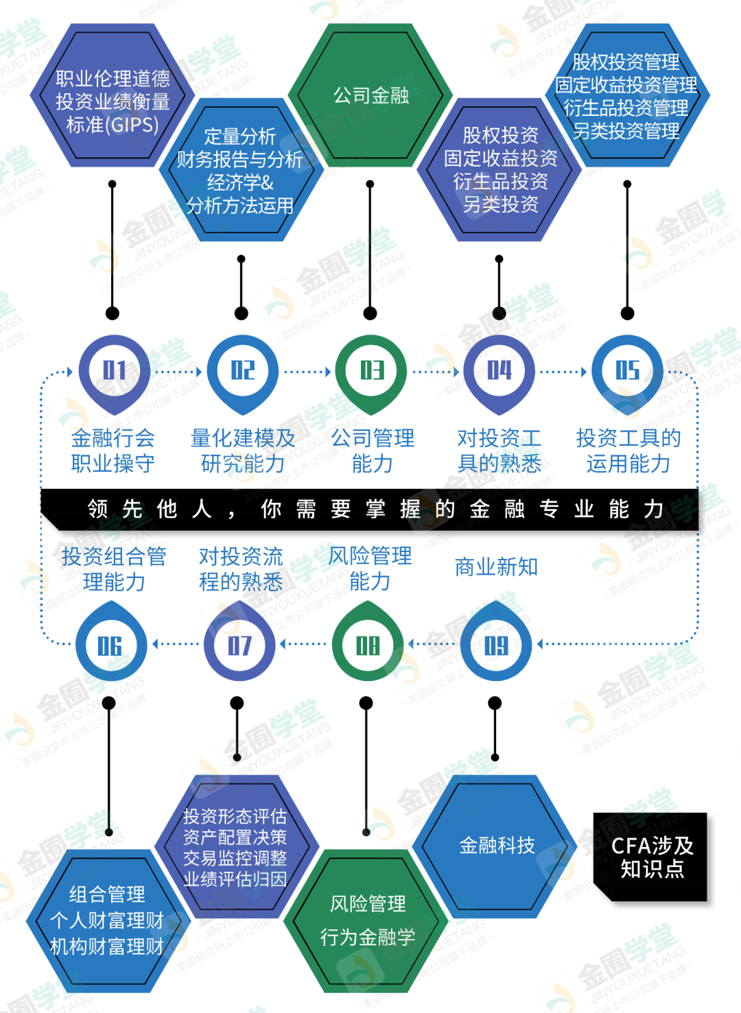 CFA的知识体系涵盖十大板块,代表了全球投资专业人士普遍接受和应用的核心知识与技能。学好CFA,能够获得完备的个人金融知识体系。