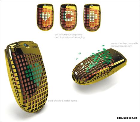 这款翻盖手机的外壳采用网状结构,而网状小孔可以自定义插入小方块来组成不同的图案,非常的有个性。