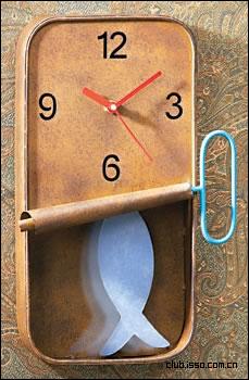 这是款有趣的挂钟,以沙丁鱼罐头为外观设计,里面的沙丁鱼甚至还可以摆动,对了,那就是挂钟的钟摆。