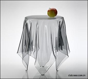 John Brauer 设计的 Illusion Table,硬质腈纶材质,手工打造,颠覆人们对桌子和桌布的惯常理解。我们见惯了四条腿的桌子和桌子上垂下的柔软的桌布,这次看到看起来貌似柔软的透明桌布居然四只脚立在地上,是不是很新奇呢?