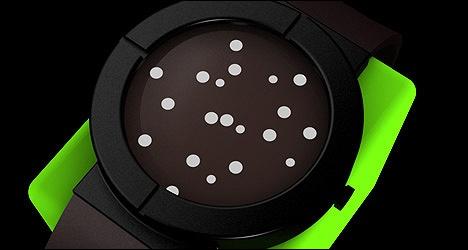 这款TIWE手表手表采用OLED设计,其独特之处在于平时手表上的白色小园点是四处游动的,当你想要看时间的时候只要摇一下手表或者敲一下表面,白色小圆点就会自动摆成指针以便于查看时间,很有创意的设计。